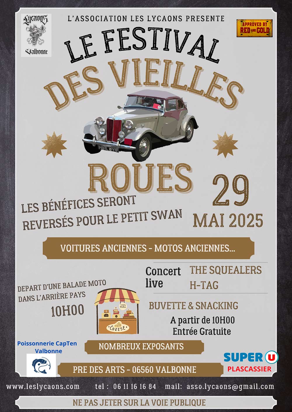 Le Festival des Vieilles Roues à Valbonne. Exposition statique de véhicules anciens et véhicules d’exception ainsi que de nombreuses motos. Ouvert tout public. Animation tout au long de la journée. Exposants et concert live avec les H-Tag et the squealers tribute AC/DC . Buvette et snacking sur place. Entrée GRATUITE. Les bénéfices de cette journée